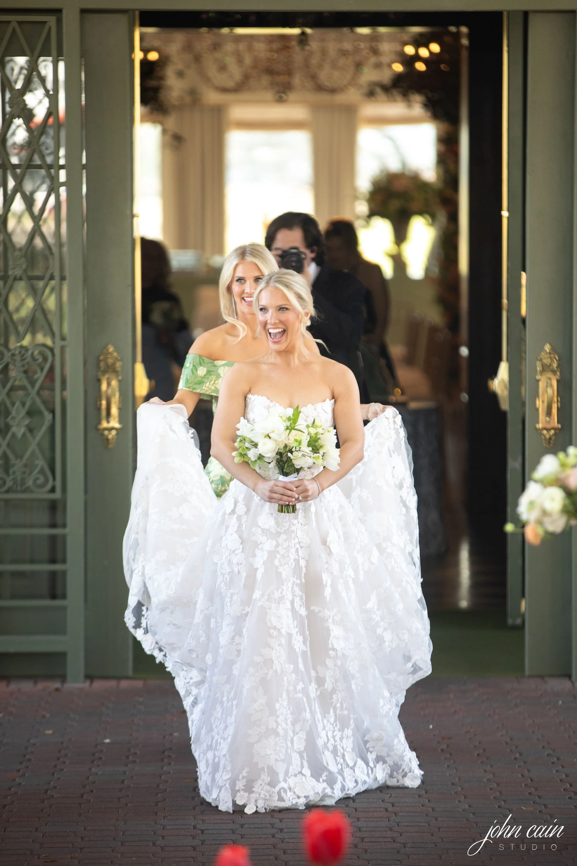 Kaitlyn’s wedding dress was semi-custom Monique Lhuillier. She combined the top of one gown, the bottom of another, and a custom-colored lining. She delighted me once again when she agreed to the white Alaia Cœur heels. I love it when my brides show personality with their wedding shoes. You will likely be able to wear them again if you do!